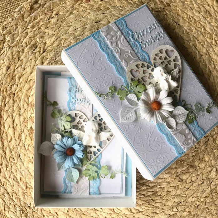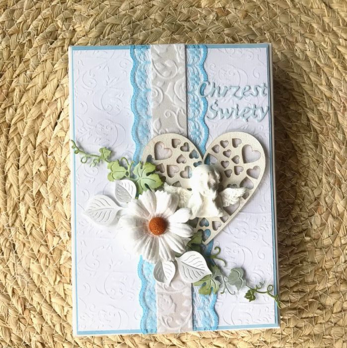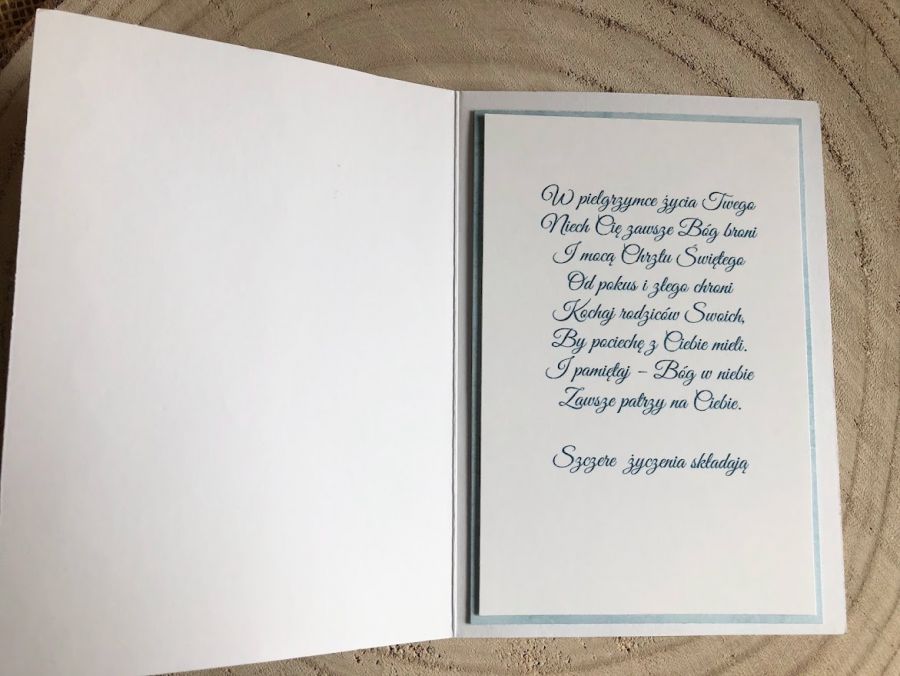 Kartka na chrzest dla chłopca. Wykonana na białej bazie.W centralnej części kartki umieszczony Aniołek,serce z dodatkiem białych kwiatków.Calość stworzona w biało-błękitnej kolorystyce. W środku kartki umieszczono gotowe życzenia do własnoręcznego podpisu a na dnie pudełka umieszczono kieszonkę na małe co nieco.Wielkość kartki 10,5x14,7cm,pudełka 12x16,5 cm. Jest możliwość dodania imienia dziecka i daty chrztu. Te informacje proszę podać w uwagach podczas zamawiania.