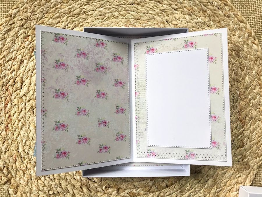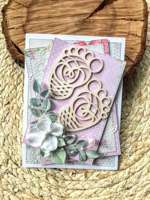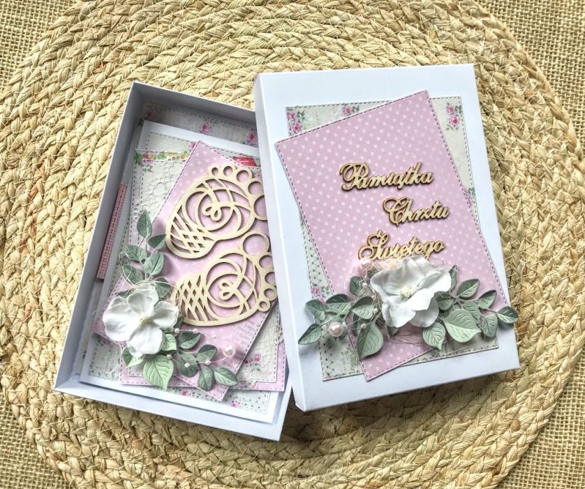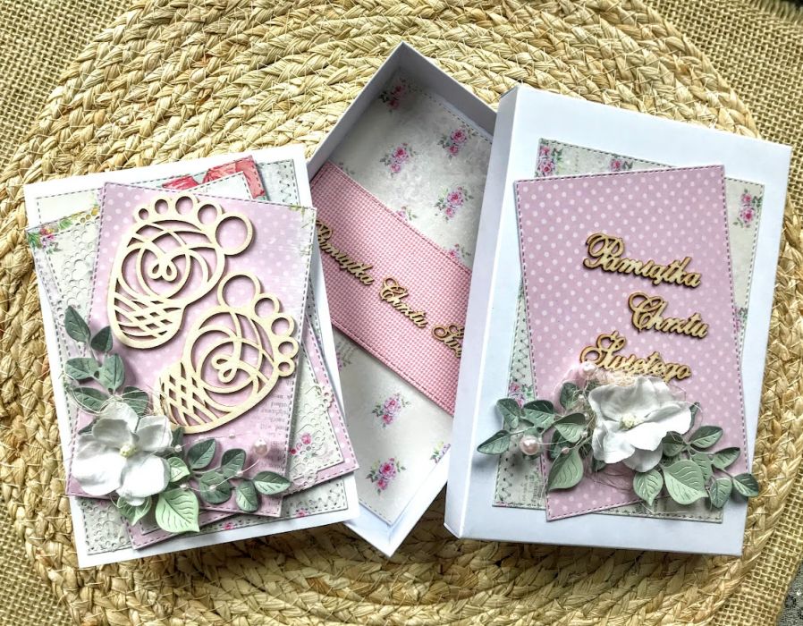 Kartka na chrzest dla dziewczynki. Wykonana na białej bazie.W centralnej części kartki umieszczono buciki z dodatkiem białych kwiatków.Calość stworzona w biało-różowej kolorystyce. W środku kartki umieszczono taga na życzenia a na dnie pudełka kieszonkę na małe co nieco.Wielkość kartki 10,5x14,7cm,pudełka 12x16,5 cm. Jest możliwość dodania imienia i daty chrztu. Te informacje proszę podać w uwagach podczas zamawiania.