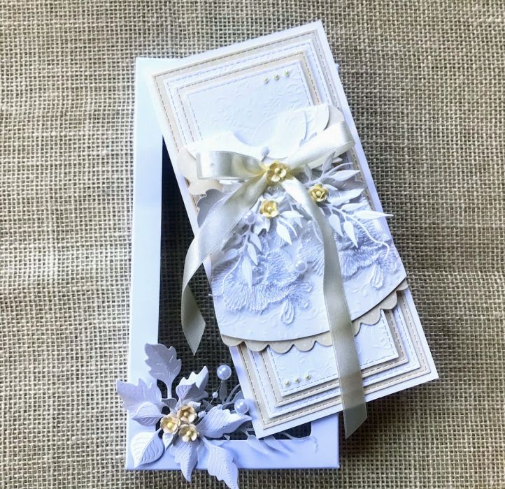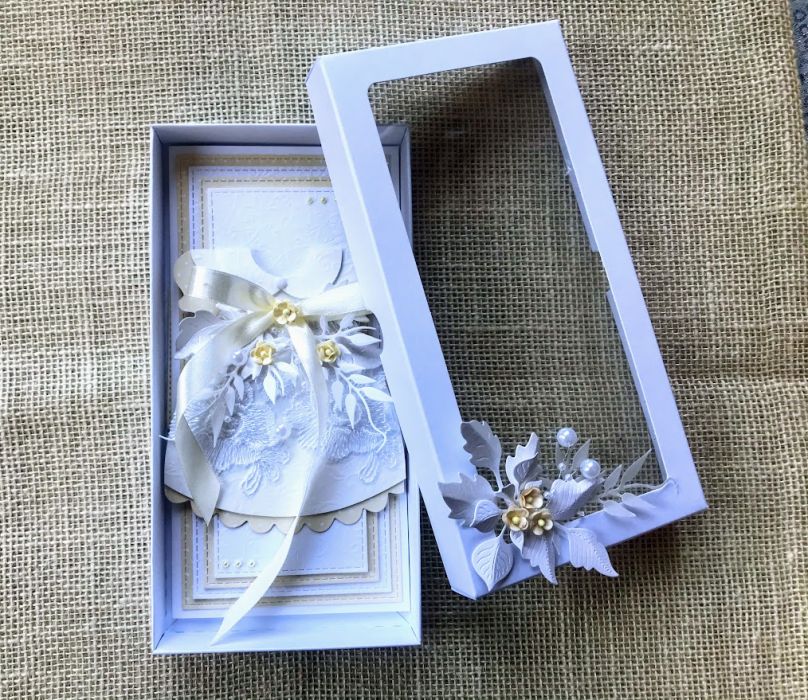 Wyjątkowa i delikatna pamiątka z okazji Chrztu Świętego dla dziewczynki. Wykonana z należytą starannością i dbałością o każdy detal. Baza kartki wykonana z białego papieru offset, bezdrzewnego i wym. 10,5 cm x 21 cm. Kartka ozdobiona warstwową kompozycją z papierowych elementów, kwiatów, koronek oraz perełek. Wewnątrz znajduje się miejsce na wpisanie życzeń Kartka jest w komplecie z białym pudełkiem , ozdobionym w takim samym stylu, Na dnie pudełka znajduje się kieszonka na małe co nieco. Wymiar pudełka 11,5 cm x 22,5 cm. W tej postaci komplet gotowy do natychmiastowej wysyłki. Polecam