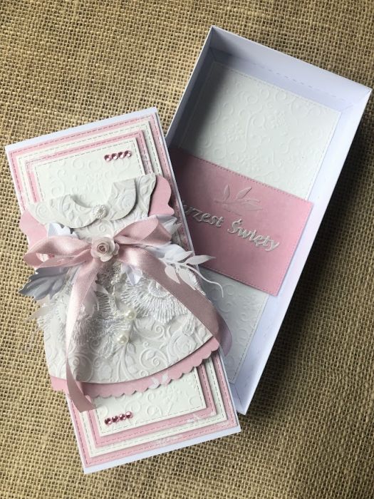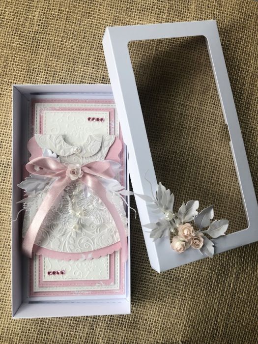 Wyjątkowa i delikatna pamiątka z okazji Chrztu Świętego dla dziewczynki. Wykonana z należytą starannością i dbałością o każdy detal. Baza kartki wykonana z białego papieru offset, bezdrzewnego i wym. 10,5 cm x 21 cm. Kartka ozdobiona warstwową kompozycją z papierowych elementów, kwiatów, koronek oraz perełek. Wewnątrz znajduje się miejsce na wpisanie życzeń Kartka jest w komplecie z białym pudełkiem , ozdobionym w takim samym stylu, Na dnie pudełka znajduje się kieszonka na małe co nieco. Wymiar pudełka 11,5 cm x 22,5 cm. W tej postaci komplet gotowy do natychmiastowej wysyłki. Polecam