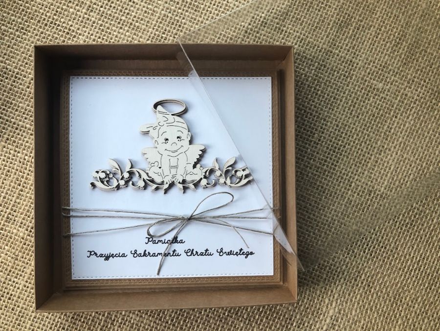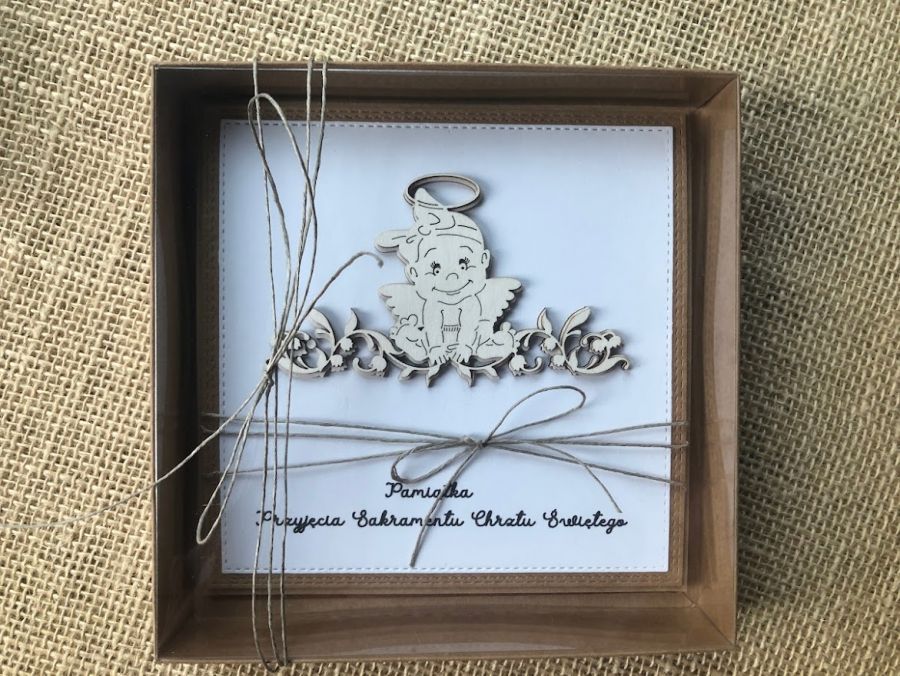 Kartka z pudełkiem na Pamiątkę Sakramentu Chrztu Świętego wykonana na bazie kraftowej tworząc styl eco.W centralnym miejscu kartki umieszczono aniołka dziewczynkę a pod nim napis - Pamiątka Sakramentu Chrztu Świętego. Całość obwiązana sznurkiem.W środkdku kartki umieszczono taga na zamieszczenie własnych życzeń oraz kieszonkę na małe co nieco. Kartka ma wymiary 14x14cm a pudełko 15,5x15,5cm.W tej postaci kartka do natychmiastowej wysyłki.