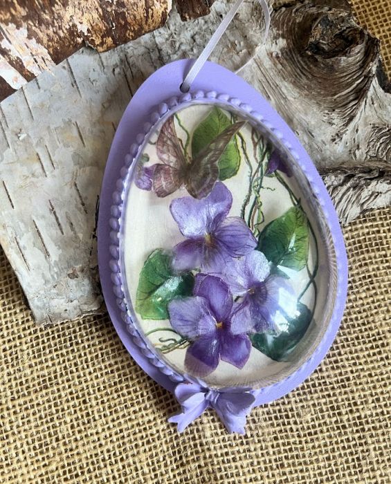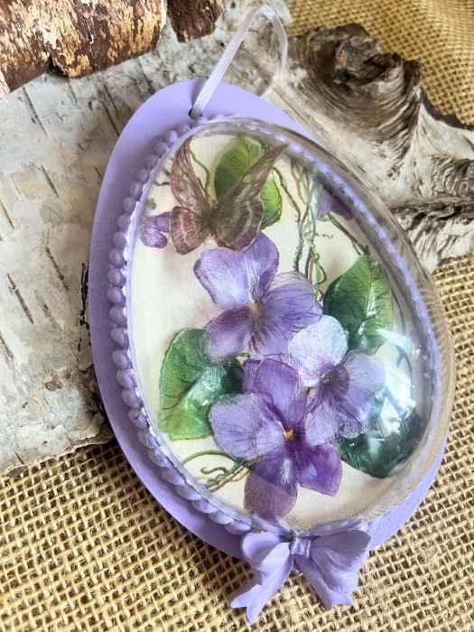 Piękna i niepowtarzalna ozdoba wielkanocna ręcznie zdobiona metodą decoupage i trójwymiarowego sospesso. Postawą jest baza wykonana z drewna w kształcie jajka o wys.15 cm a szer.10,5 cm w najszerszym miejscu. Na bazie umieszczono połówkę akrylowego jajka, wewnątrz którego umieszczono motyw fiołków,motyli wykonanych metodą sospesso.Będzie piękną ozdobą wielkanocnego stołu lub okna. Podarowane w prezencie sprawią radość osobie obdarowanej.