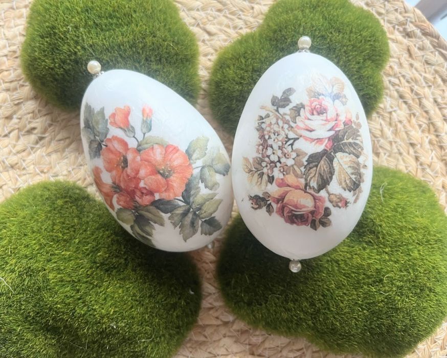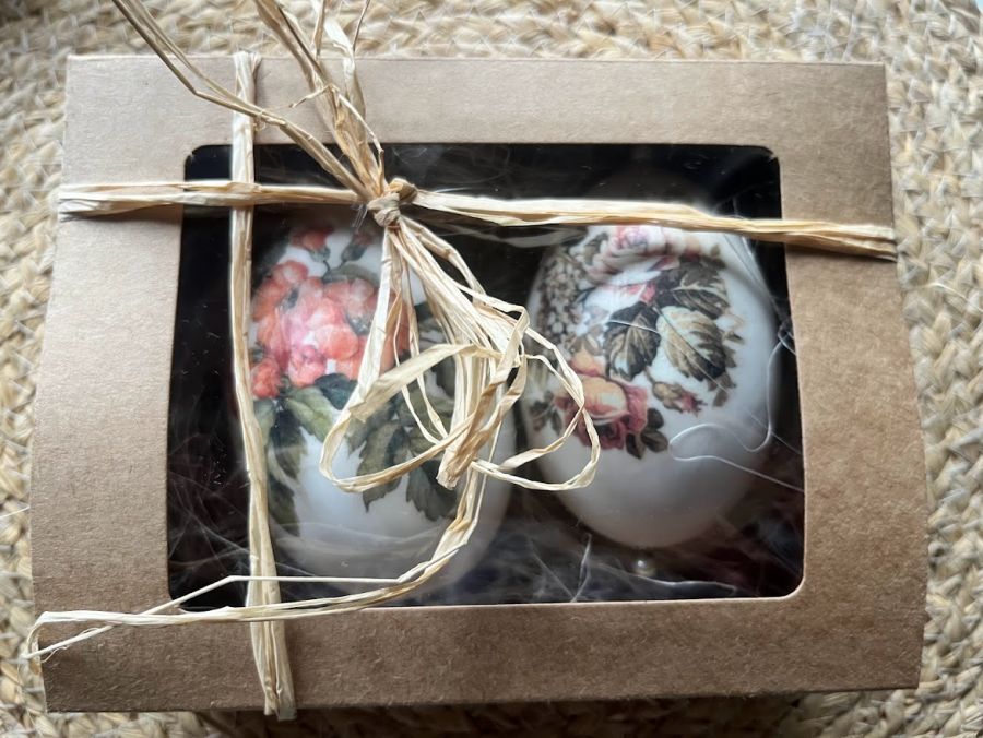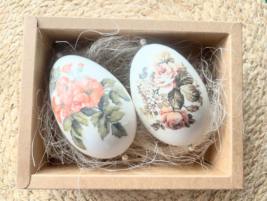 Niezwykle oryginalna dekoracja wielkanocna w formie pisanek gęsich z motywem wiosennych kwiatów.. Komplet stanowią 2szt. gęsich pisanek utrzymane w jednej tonacji i stylu. Będą doskonale prezentować się na wielkanocnym stole, w wazonie wśród gałązek wierzby czy też w wielkanocnym koszyku.Pisanki zostały zapakowane w piękne pudełko z okienkiem na sizalu .Wymiary pudełka 17x13x5,5.Pudełko przewiązane naturalnym sizalem. Ich kolorystyka wywoła uśmiech na twarzy domowników i gości.