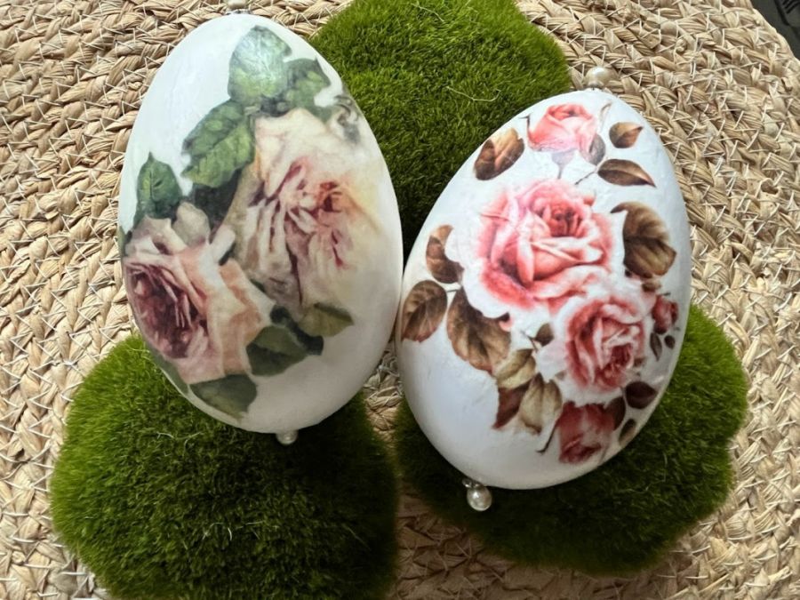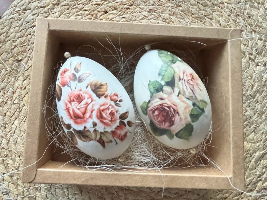 Niezwykle oryginalna dekoracja wielkanocna w formie pisanek gęsich z motywem kwiatów.Wykonana metodą decoupage.Komplet stanowią 2szt. gęsich pisanek utrzymane w jednej tonacji i stylu. Będą doskonale prezentować się na wielkanocnym stole, w wazonie wśród gałązek wierzby czy też w wielkanocnym koszyku.Pisanki zostały zapakowane w piękne pudełko z okienkiem na sizalu .Wymiary pudełka 17x13x5,5.Pudełko przewiązane naturalnym sizalem. Ich kolorystyka wywoła uśmiech na twarzy domowników i gości.