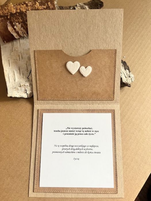 Kartka z okazji Ślubu dla Młodej Pary , która kocha podróże i wybiera się w szczęśliwą podróż przez wspólne życie z urokliwymi samolotami.. Komplet: koperta i kartka stworzona na bazie papieru scrapowego kraftowego,który przełamuje dodatek w kolorze złamanej bieli. Kartka ma wymiary 14 x 14, koperta ma wymiary 15,5 x 15,5. Całość obwiązana sznurkiem z tagiem – biletem .W środku kartki znajduje się miejsce z gotowymi życzeniami do własnoręcznego podpisu oraz umieszczono kieszonkę na małe co nieco lub kupon lotto. W tej postaci produkt dostępny od ręki .Pozdrawiam