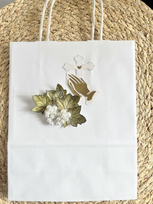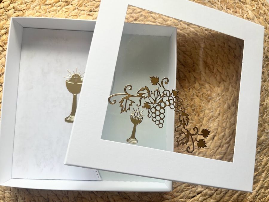 Elegancka, bogato zdobiona kartka w pudełku z okazji Pierwszej Komunii Świętej. Utrzymana w całości w bieli , błękitu z elementem złota .ozdobiona kiśćmi winogron.Kartka jest w całości wykonana ręcznie z najlepszej jakości materiałów do scrapbookingu. Wielkość pudełka 16,0×16,0×2,5. Wielkość kartki 15×15 z gotowymi życzeniami.do własnoręcznego podpisu.. Na dnie pudełka umieszczono kieszonkę na małe co nieco.Do kartki dołączono torebkę w tej samej stylizacji. Wielkość torebki 22,5x18x8cm