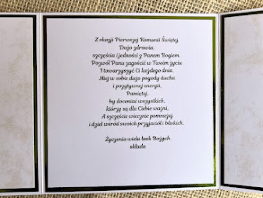 Komplet prezentowy, komunijny zawiera: Piękną i wyjątkową kartkę komunijną w kolorze biało-zielonej; rozmiar kartki 14,0x14,0; pudełko o wymiarach 15,0 x 15,0 z bezbarwnym wieczkiem, wewnątrz kartki gotowe życzenia do własnoręcznego podpisu a na dnie pudelka kieszonka na małe co nieco, Do kompletu biała torebka ozdobiona w tej samej stylistyce co kartka. Wymiar torebki 22,0x18,0. W tej postaci produkt gotowy do natychmiastowej wysyłki