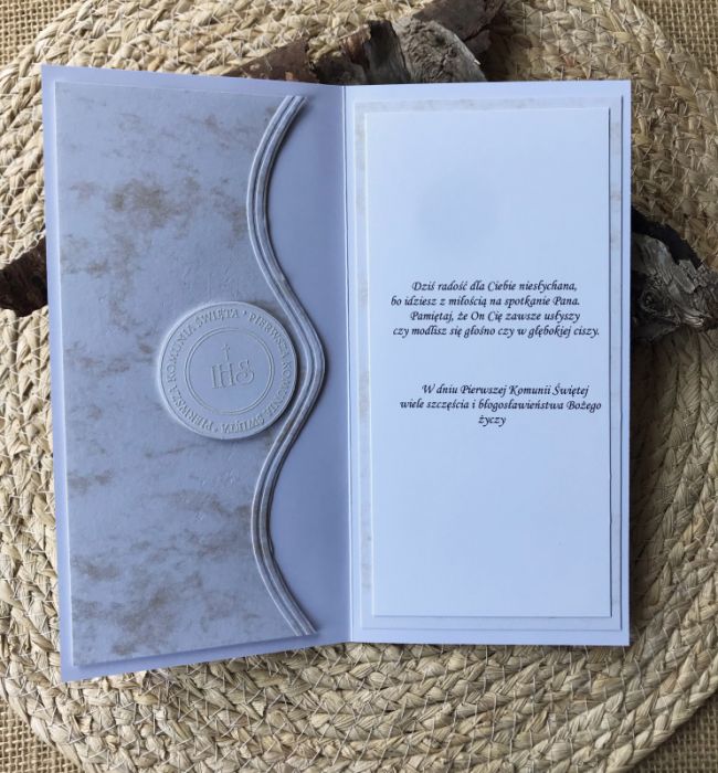 Komplet prezentowy, komunijny zawiera: Piękną i wyjątkową kartkę komunijną w kolorze biało-złotej ; rozmiar kartki 10,5x21,0; koperta 3D o wymiarach 11, x 22,0x1,5 Ozdobione dopasowanymi do karty i koperty dodatkami, wewnątrz kartki gotowe życzenia do własnoręcznego podpisu oraz kieszonka na małe co nieco,