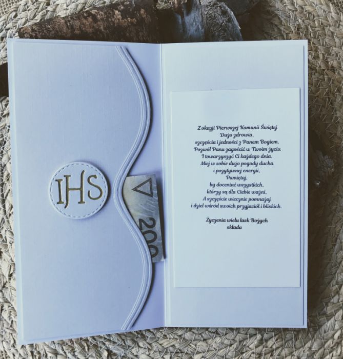 Komplet prezentowy, komunijny zawiera: Piękną i wyjątkową kartkę komunijną w kolorze biało-złotej ; rozmiar kartki 10,5x21,0; koperta 3D o wymiarach 11, x 22,0x1,5 Ozdobione dopasowanymi do karty i koperty dodatkami, wewnątrz kartki gotowe życzenia do własnoręcznego podpisu oraz kieszonka na małe co nieco,