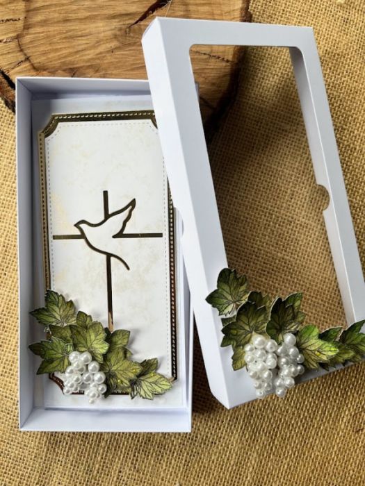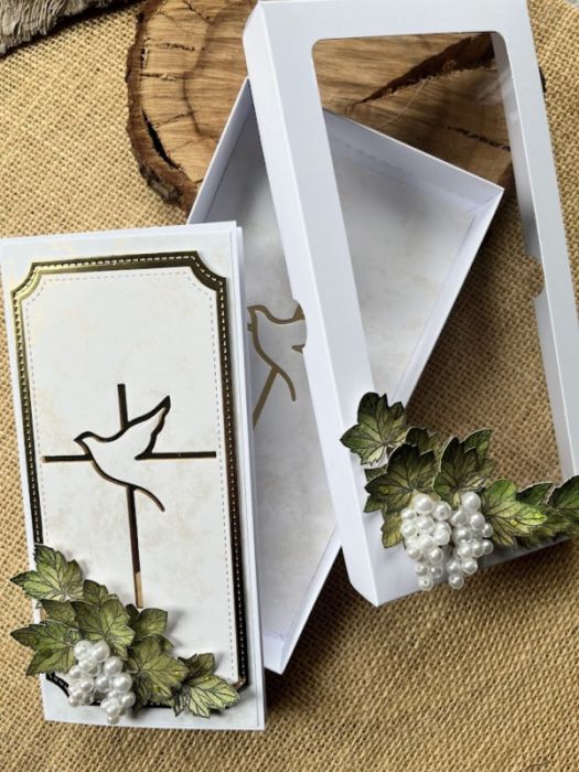 Elegancka, bogato zdobiona kartka w pudełku z okazji Komunii świętej. Utrzymana w delikatnej kolorystyce - bieli i złota.ozdobiona gronami winogron oraz krzyżem z gołębiem Kartka jest w całości wykonana ręcznie z najlepszej jakości materiałów do scrapbookingu. Wielkość pudełka 22,5x11,5x3,0.Wielkość kartki 21x10,5 , wewnątrz umieszczono gotowe życzenia do własnoręcznego podpisu oraz umieszczono kieszonkę na małe co nieco. w tej postaci produkt dostępny od ręki .Polecam