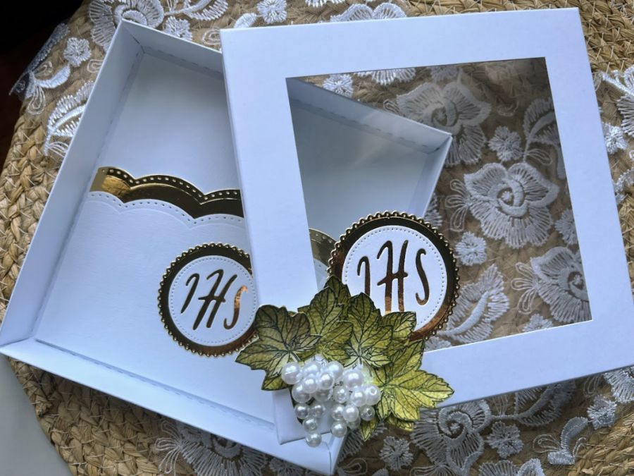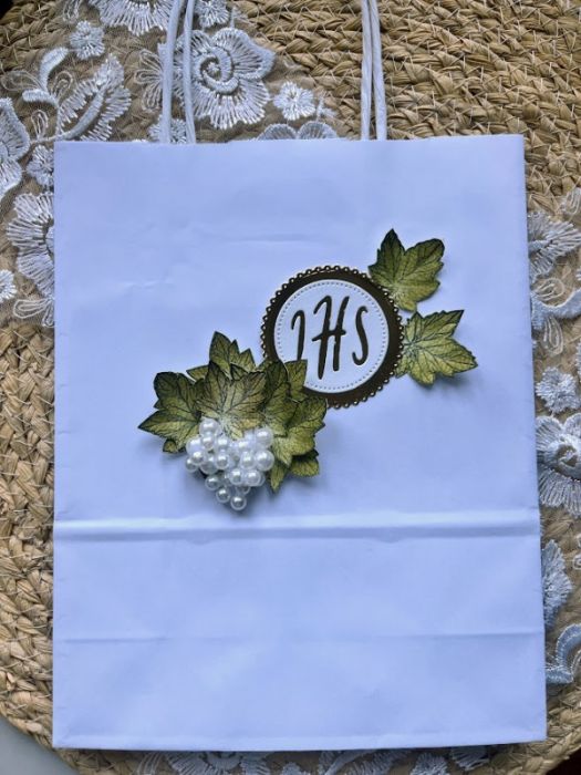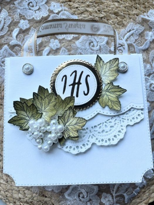 Kartka jest ozdobiona ręcznie robionymi kiściami winogron i elementami 3D. Wykonana z dokładnością i starannością o szczegóły z wysokiej jakości sztywnych papierów, dzięki czemu może stać jako ozdoba .Stworzona w kolorystyce bieli i lustrzanego złota.. Wewnątrz kartki znajdują się gotowe życzenia do własnoręcznego podpisu a na dnie pudełka kieszonka na małe co nieco.Torebeczka posiada uchwyt ze wstążeczki . Wyjątkowa, jedyna w swoim rodzaju pamiątka .