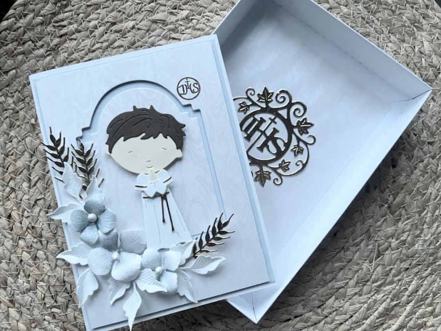 Nazwa produktu: 154,KOMUNIA, Kartka na komunię dla chłopca w pudełku z życzeniami
