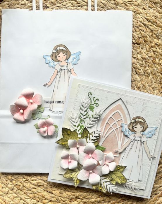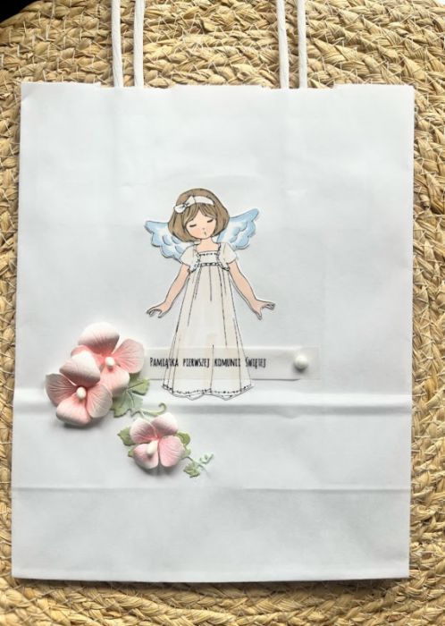 Komplet prezentowy, komunijny zawiera: Piękną i wyjątkową kartkę komunijną w pastelowych kolorach; rozmiar kartki 14,5x14,5cm;pudełko z okienkiem o wymiarach 15,5x 15,5x2,5cm oraz torebkę : rozmiar 22,5x18cm, ozdobioną dopasowanymi do kartki dodatkami, wewnątrz kartki gotowe życzenia do własnoręcznego wpisu oraz kieszonka na małe co nieco, W tej postaci produkt gotowy do natychmiastowej wysyłki.