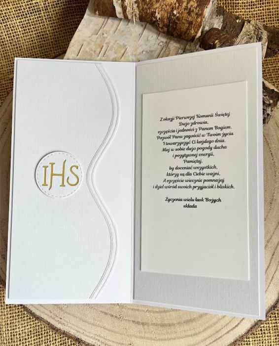 Komplet prezentowy, komunijny zawiera: Piękną i wyjątkową kartkę komunijną w kolorze biało- błękitnej ; rozmiar kartki 10,5x21,0; pudełko o wymiarach 11,5 x 22,5 Ozdobione dopasowanymi do karty i pudełka dodatkami, wewnątrz kartki gotowe życzenia do własnoręcznego podpisu i kieszonka na małe co nieco, W tej postaci produkt gotowy do natychmiastowej wysyłki