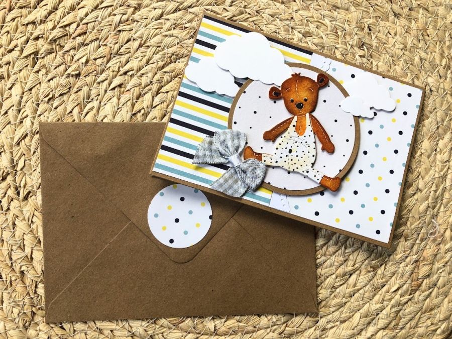 Urocza kartka z okazji narodzin bobasa/ chrztu lub urodzinek - wykonana na bazie kartonu eko-kraft z misiem.Wielkość kartki to 14,5x10,5.Wewnątrz miejsce na życzenia oraz kieszonka na małe co nieco. do karty dołączona eko koperta - solidna, o bardzo wysokiej gramaturze 16,0x11,5 (120g), ozdobiona pasującym motywem. na zdjęciu pokazana koperta