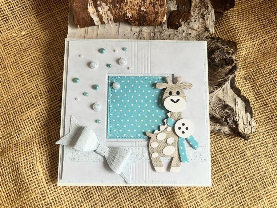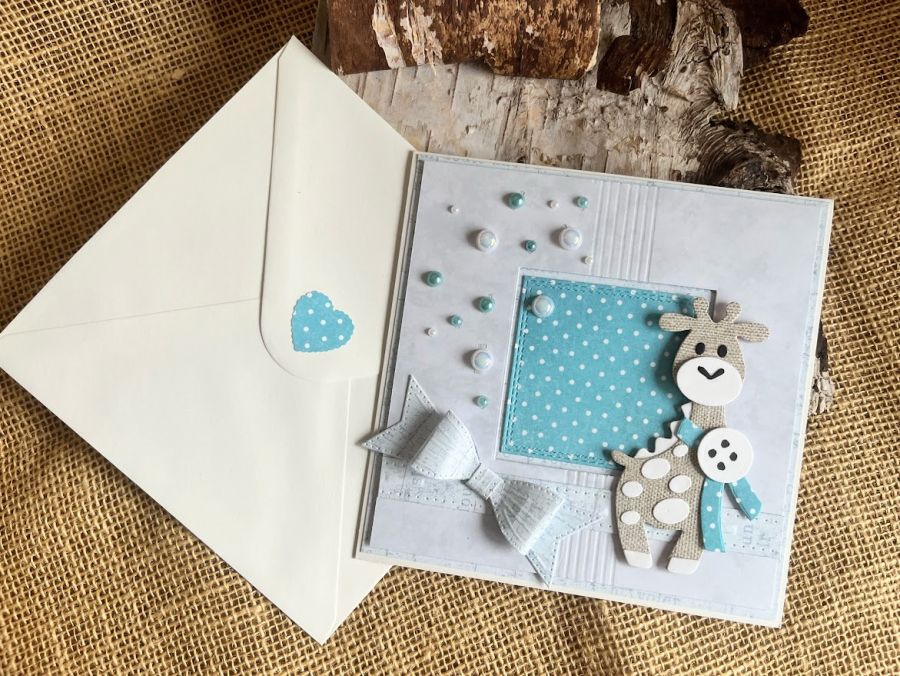 Urocza kartka z okazji narodzin maluszka/ chrztu lub urodzinek - wykonana na bazie białego kartonu z uroczą żyrafą. Wielkość kartki to 15,0x15,0.Wewnątrz miejsce na życzenia oraz kieszonka na małe co nieco. Wszystko utrzymane w kolorystyce biało - błękitnej. do karty dołączona biała koperta- 16,0x16,0 , ozdobiona serduszkiem.