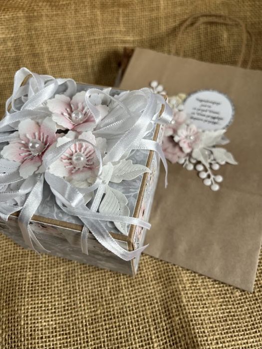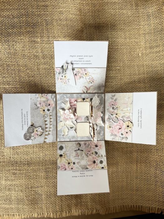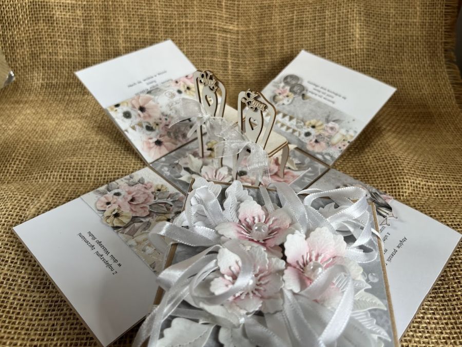 Pudełko eksplodujące tzw. exploding box to atrakcyjny i popularny zamiennik z kartką. Złożone 4 ścianki zamknięte wieczkiem , które po jego zdjęciu rozpadają się na 4 strony świata. Wielkość poszczególnych części to 10 x 10 cm i tak samo złożone pudełko w całość ma te same wymiary. Na czterech ściankach umieściłam kieszonkę na małe co nieco lub kupon lotto pod wieczkiem pudełka umieszczono gotowe życzenia do podpisania lub dodatkowa czysta karta do wpisania ręcznie życzeń przez kupującego.W centralnej części pudełka umieszczono makietę dwóch krzesełek. Do exploding boxa dołączono torebkę udekorowano w tej samej stylizacji. W tej wersji pudełko jest dostępne od ręki. Polecam