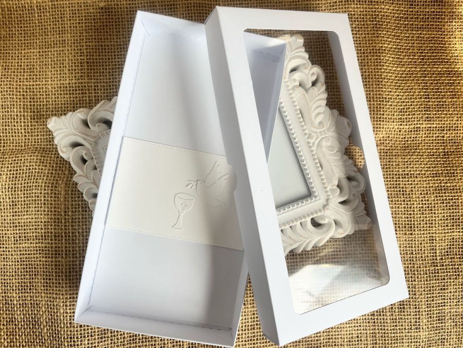 Ręcznie robiona przestrzenna kartka komunijna wraz z pudełkiem. Stworzona na białej bazie papierów z dodatkiem delikatnego błekitu i złota.Kartka jest zdobiona tłoczeniami ,elementami komunijnymi,które tworzą chłopięcą kompozycję.Kartka ma wymiary 10,5x21cm.Pudełko ma wymiary 22,5x11,5cm.Wewnątrz kartki zamieszczono gotowe życzenia do własnoręcznego podpisu a na dnie pudełka umieszczono kieszonkę na małe co nieco.Jest możliwość dodania imienia i daty komunii.