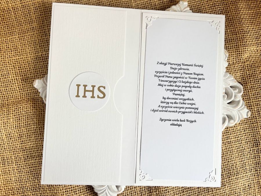 Ręcznie robiona przestrzenna kartka komunijna wraz z kopertą. Stworzona na białej bazie papierów z dodatkiem delikatnegobłękitu i złota.Kartka jest zdobiona kwiatami ,elementami komunijnymi,które tworzą chłopięcą kompozycję.Kartka ma wymiary 10,5x21cm.Koperta ma wymiary 22x11cm.Wewnątrz kartki zamieszczono gotowe życzenia do własnoręcznego podpisu oraz umieszczono kieszonkę na małe co nieco.Jest możliwość dodania imienia i daty komunii.