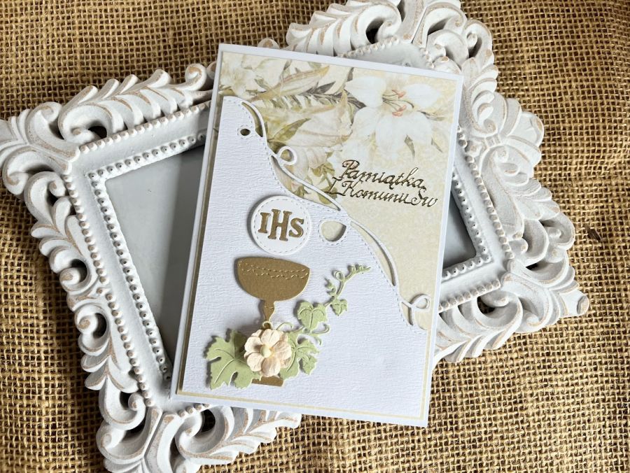 Elegancka, umiarkowanie zdobiona kartka z okazji Komunii świętej. Utrzymana w delikatnej kolorystyce - bieli i błękitu.ozdobiona liśćmi winogron,kielichem IHS oraz złotym napisem Kartka jest w całości wykonana ręcznie z najlepszej jakości materiałów do scrapbookingu.Wielkość kartki 14,8x10,5 wewnątrz umieszczono taga na zamieszczenie życzeń oraz kieszonkę na małe co nieco. Do kartki dołączono białą kopertę. w tej postaci produkt dostępny od ręki .Polecam