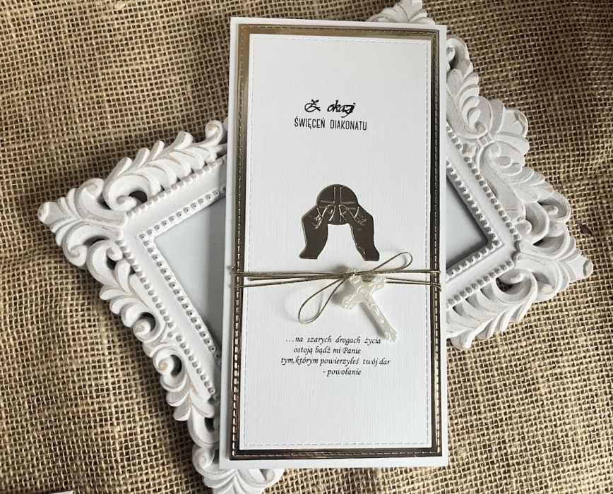 Kartka z okazji święceń diakonatu. Wykonana ręcznie z największą starannością i ozdobiona wymowną symboliką. Stworzona w kolorystyce złoto- białej z cytatem.Wnętrze kartki skrywa miejsce na wypisanie własnych życzeń. Wielkość kartki 11 x 21 w komplecie z białą kopertą. W tej postaci kartka dostępna od ręki.Zapraszam
