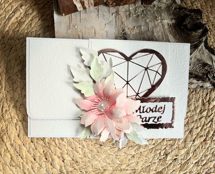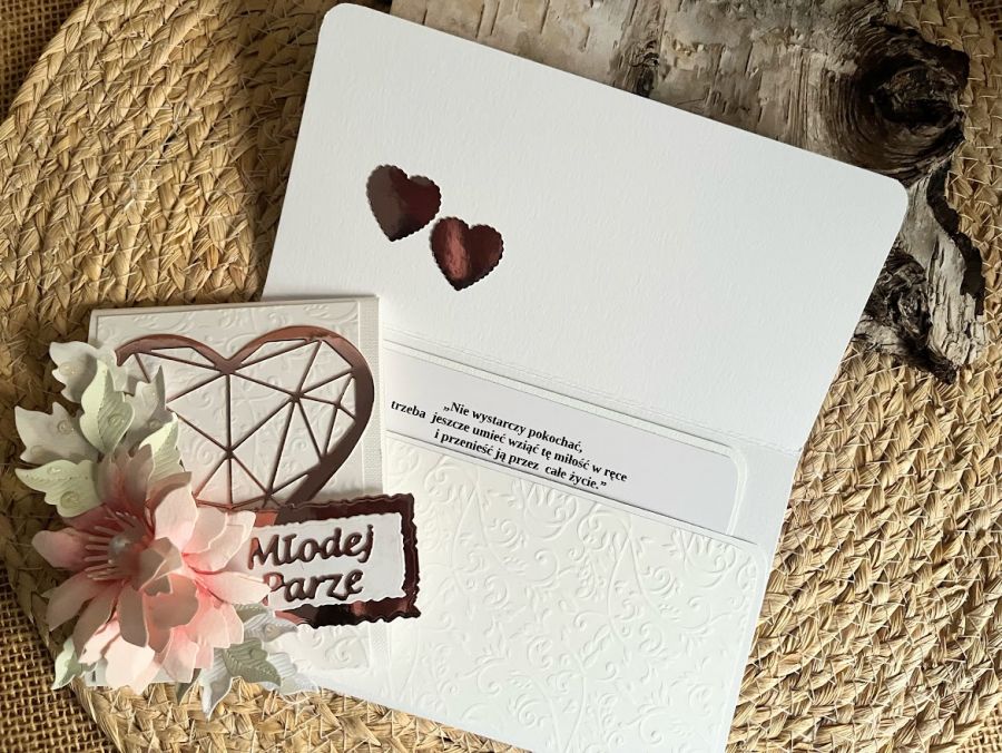 Elegancka kartka ślubna w formie kopertówki.W kolorystyce cynkowej bieli z dodatkiem lustrzanego różowego złota.. Wykonana w całości ręcznie, dbałością o szczegóły. Ozdobiona za pomocą perłowego tłoczonego papieru do scrapbookingu, pięknej kompozycji kwiatowej oraz geometrycznego serca i napisu .Wielkość kartki to 18 x 10,5 .Dzięki swojej formie, kartka ta pozwala w elegancki sposób przekazać zarówno życzenia, jak i prezent w postaci gotówki. W środku znajduje się ozdobna wkładka z gotowymi życzeniami. W tej postaci kartka dostępna od ręki.Polecam