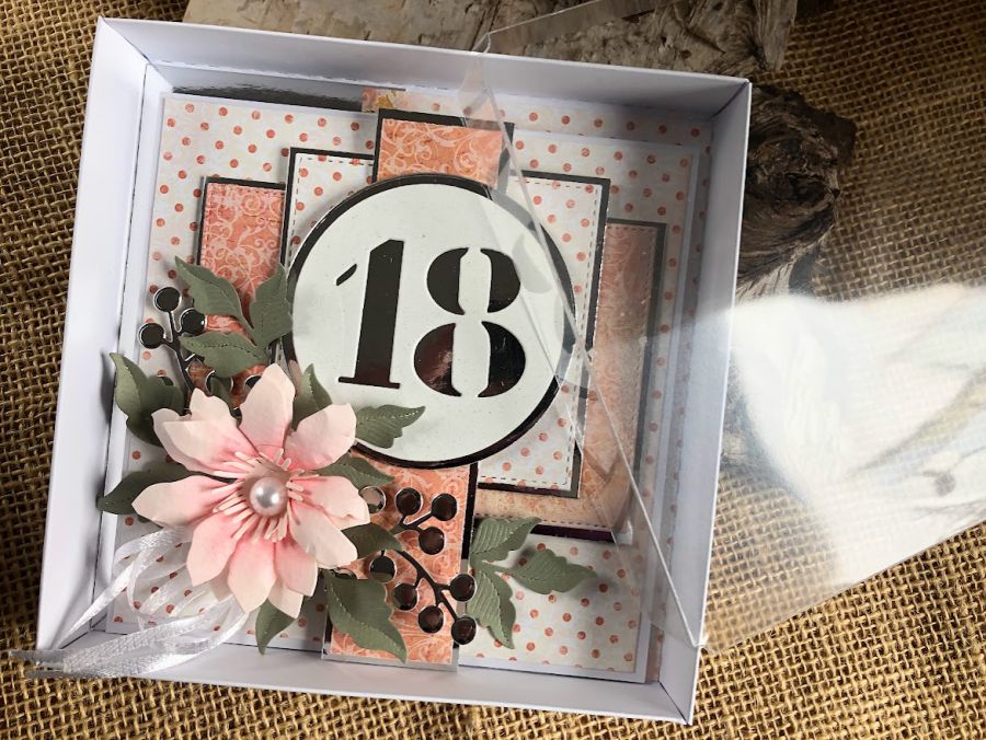 Kartka z okazji 18-tych urodzin w pudełku z transparentnym wieczkiem.Kartka i pudełlko powstało na białej bazie i papierów skrapowych idealnie dopasowanych kolorystycznie a wszystko podbite lustrzanym srebrem ,który stworzyło niesamowity efekt.Wnętrze kartki skrywa kieszonkę na małe co nieco oraz tag na wpisanie życzeń.Wymiary kartki 14x14cm a pudeka 15x15cm.W tej postaci komplet gotowy do natychmiastowej wysyłki.