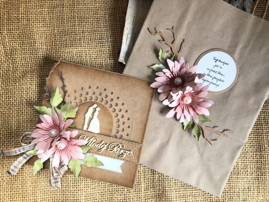 Kartka z okazji Ślubu wykonana ręcznie z niezwykłą starannością i dbałością o każdy detal. Na bazie z papieru kraftowego, w naturalnej brązowej kolorystyce z dodatkiempudrowego różu z elegancką kwiatową kompozycją oraz ażurową bazą. Rozmiar ok 14,0 x 14,0 cm. Wewnątrz kartki znajdują się gotowe życzenia oraz kieszonka na małe co nieco, W komplecie pudełko z papieru kraftowego (rozmiar 15,5 x 15,5 cm) z bezbarwnym wieczkiem, Do kompletu dodano torebkę eco ozdobioną w tej samej stylizacji. Wielkośc torebki 18x21x8.W tej postaci komplet dostępny od ręki. Jest możliwość dodania imion nowożeńców i daty ślubu.