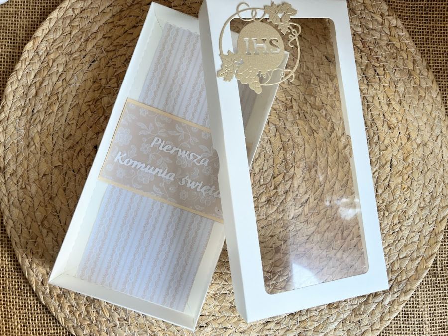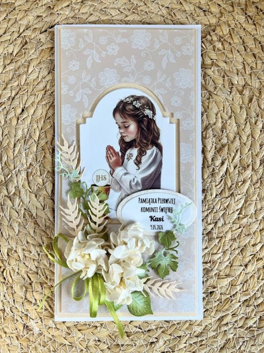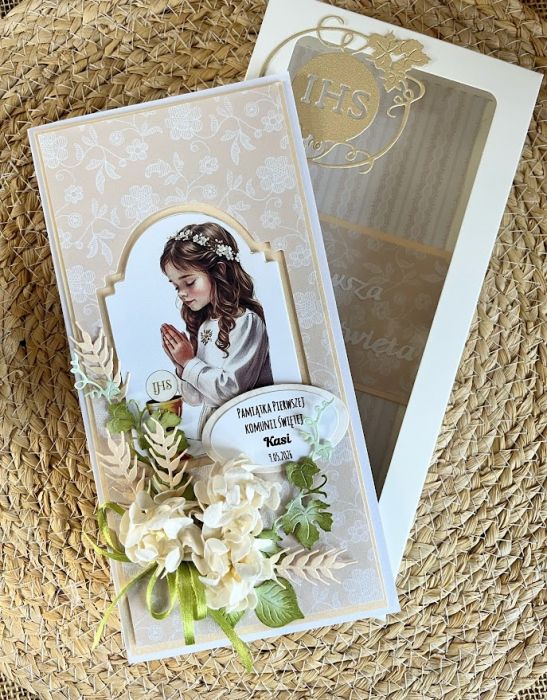 Ręcznie robiona przestrzenna kartka komunijna wraz z pudełkiem. Stworzona na ecru bazie papierów z dodatkiem delikatnego ecru i złota.Kartka jest zdobiona tłoczeniami ,elementami komunijnymi,które tworzą dziewczęcą kompozycję.Kartka ma wymiary 10,5x21cm.Pudełko ma wymiary 22,5x11,5cm.Wewnątrz kartki zamieszczono gotowe życzenia do własnoręcznego podpisu a na dnie pudełka umieszczono kieszonkę na małe co nieco.Jest możliwość dodania imienia i daty komunii.Proszę o umieszczenie w uwagach podczas zamawiania.