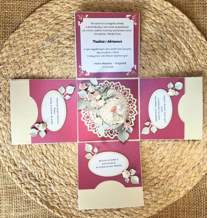 Pudełko eksplodujące tzw. exploding box to atrakcyjny i popularny zamiennik z kartką. Złożone 4 ścianki zamknięte wieczkiem , które po jego zdjęciu rozpadają się na 4 strony świata. Wielkość poszczególnych części to 10 x 10 cm i tak samo złożone pudełko w całość ma te same wymiary. Na trzech ściankach umieściłam kieszonkę na małe co nieco lub kupon lotto na których umieściłam cytaty,sentencje ,odpowiednie do ceremoni. a na czwartej umieszczono gotowe życzenia. Do kompletu stworzono torebkę ozdobioną w tym samym stylu co box o wym.18x22,5x8 cm.W centralnej części pudełka umieszczono miniaturowy tort z bukietem kwiatów i gołąbkami trzymającymi obrączki.Natomiast na wieczku pudełka umieszczono bukiet kwiatów z obrączkami. Całość stworzono w kolorystyce fuksjowo- kremowej na tłoczonych papierach .