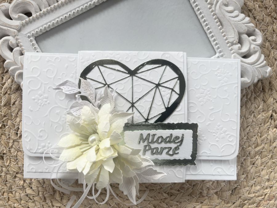 Elegancka kartka ślubna w formie kopertówki.W kolorystyce cynkowej bieli z dodatkiem lustrzanego seledynu. Wykonana w całości ręcznie, dbałością o szczegóły. Ozdobiona za pomocą perłowego tłoczonego papieru do scrapbookingu, pięknej kompozycji kwiatowej oraz geometrycznego serca i napisu .Wielkość kartki to 18 x 10,5 .Dzięki swojej formie, kartka ta pozwala w elegancki sposób przekazać zarówno życzenia, jak i prezent w postaci gotówki. W środku znajduje się ozdobna wkładka z gotowymi życzeniami. W tej postaci kartka dostępna od ręki.Polecam