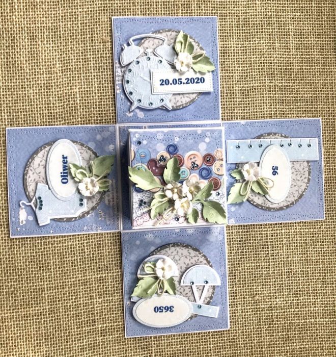 Wykonuję dla chłopczyka. Exploding box to pudełeczko o wymiarach 10 x 10 x 10 cm. Po uniesieniu wieczka ścianki boxa rozkładają się.