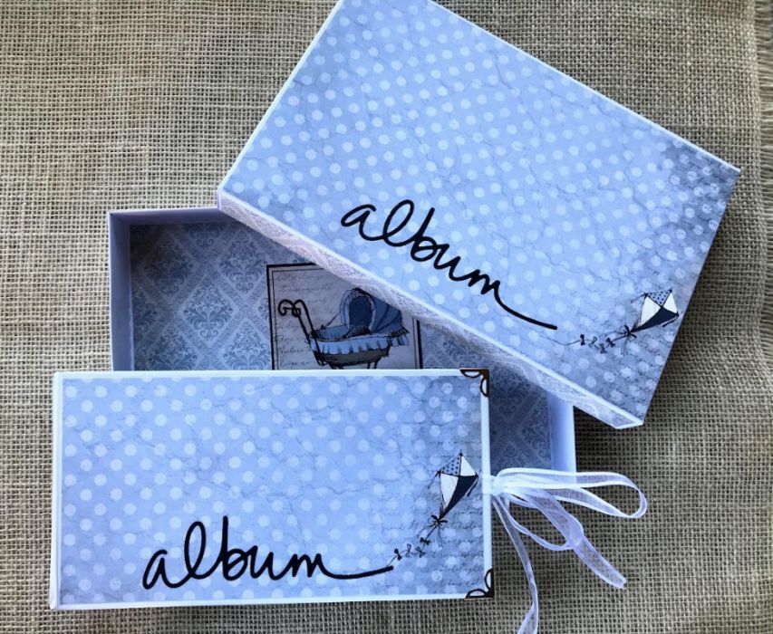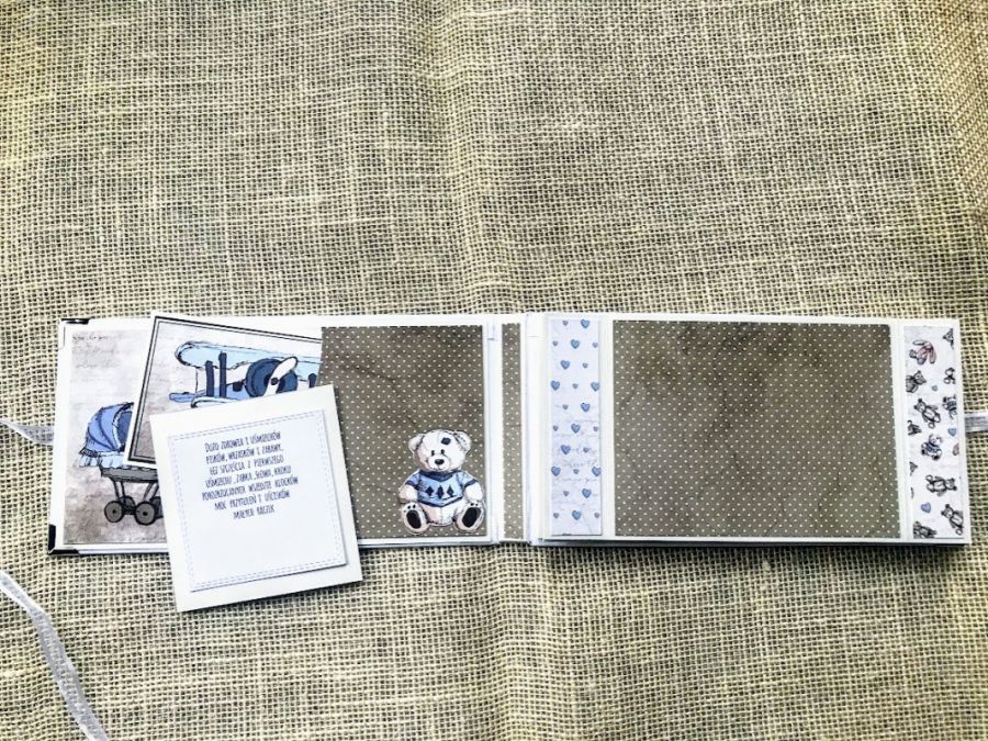 Album to idealny prezent dla dziecka na urodziny w szczególności pierwsze a także na chrzest bądź jako upominek na Baby shower. Wykonany z ogromną starannością i dbałością o szczegóły i detale a co najważniejsze z pasją. Wykorzystano produkty polskich producentów gwarantujących najwyższą jakość towarów. Album ma rozmiar 21,5 x 11,5 i może pomieścić 13 zdjęć w rozmiarze 9x13. Ponadto w środku jest miejsce na dedykację na jednym z dołączonych tagów oraz dołączono gotowe życzenia do wyboru. Rogi albumu zabezpieczono metalowymi narożnikami. Album jest w kolorze starego błękitu a zatem dedykowany chłopcu. Do albumu dołączono kartkę w tej samej stylistyce w rom.14x14 wraz z kopertą oraz pudełko na album.Jest możliwość zamieszczenia imienia na okładce albumu jeżeli będzie państwo mieli takie życzenie. Pojedynczy egzemplarz.
