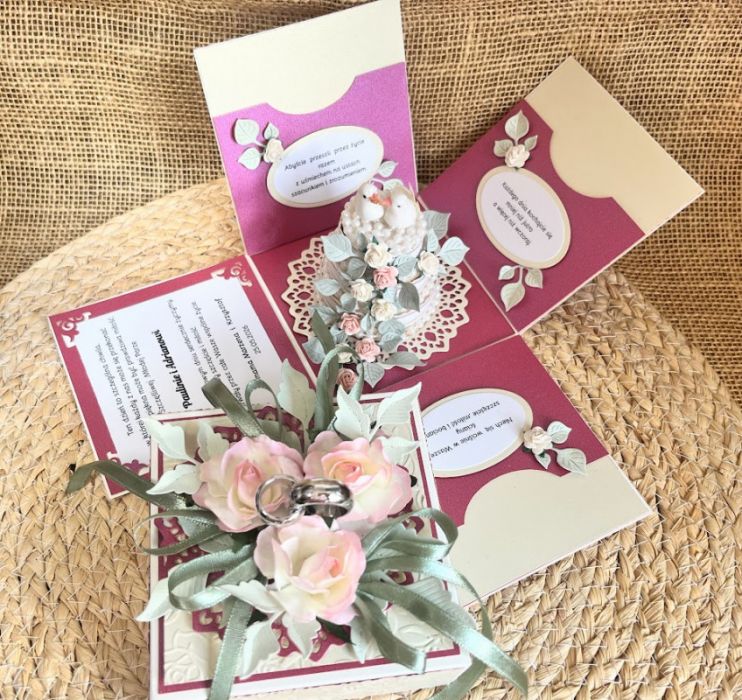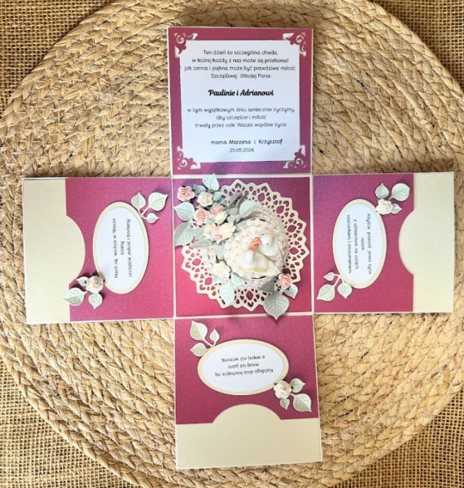Pudełko eksplodujące tzw. exploding box to atrakcyjny i popularny zamiennik z kartką. Złożone 4 ścianki zamknięte wieczkiem , które po jego zdjęciu rozpadają się na 4 strony świata. Wielkość poszczególnych części to 10 x 10 cm i tak samo złożone pudełko w całość ma te same wymiary. Na trzech ściankach umieściłam kieszonkę na małe co nieco lub kupon lotto na których umieściłam cytaty,sentencje ,odpowiednie do ceremoni. a na czwartej umieszczono gotowe życzenia. Do kompletu stworzono torebkę ozdobioną w tym samym stylu co box.W centralnej części pudełka umieszczono miniaturowy tort z bukietem kwiatów i gołąbkami trzymającymi obrączki.Natomiast na wieczku pudełka umieszczono bukiet kwiatów z obrączkami. Całość stworzono w kolorystyce fuksjowo- kremowej na tłoczonych papierach .