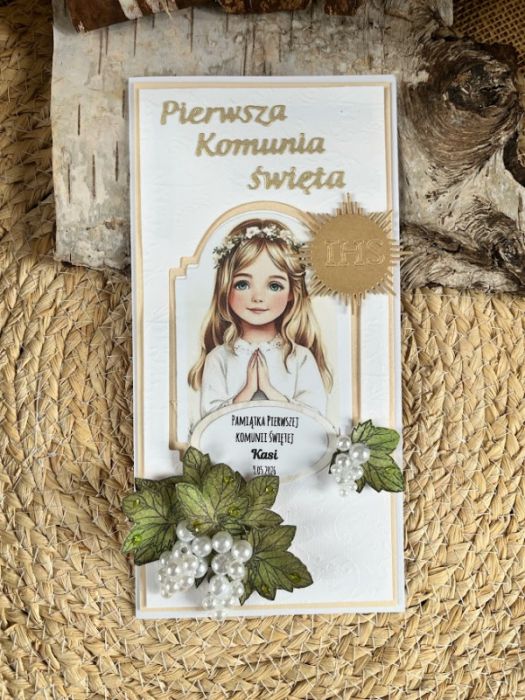 Ręcznie robiona przestrzenna kartka komunijna wraz z pudełkiem. Stworzona na białej bazie papierów z dodatkiem delikatnego ecru i złota.Kartka jest zdobiona tłoczeniami ,elementami komunijnymi,które tworzą dziewczęcą kompozycję.Kartka ma wymiary 10,5x21cm.Pudełko ma wymiary 22,5x11,5cm.Wewnątrz kartki zamieszczono gotowe życzenia do własnoręcznego podpisu a na dnie pudełka umieszczono kieszonkę na małe co nieco.Jest możliwość dodania imienia i daty komunii oraz imion osób składających życzenia.Proszę o umieszczenie w uwagach podczas zamawiania.