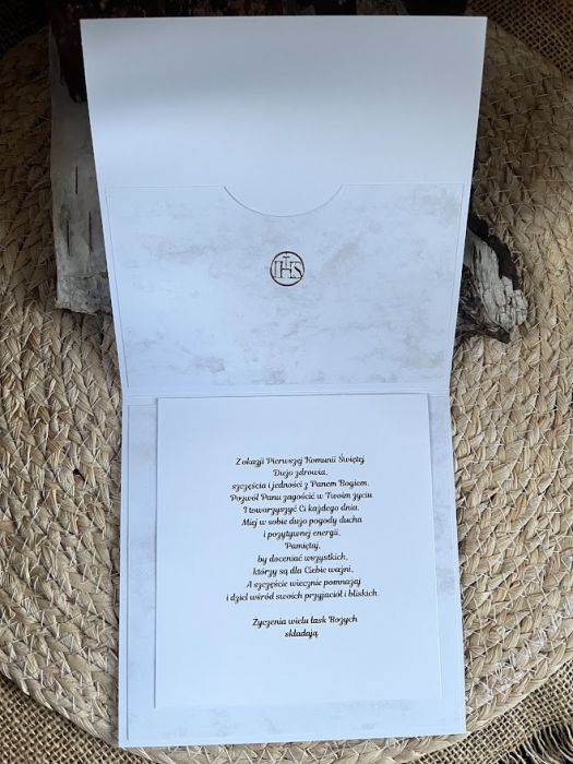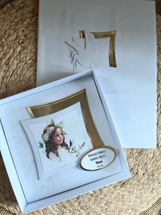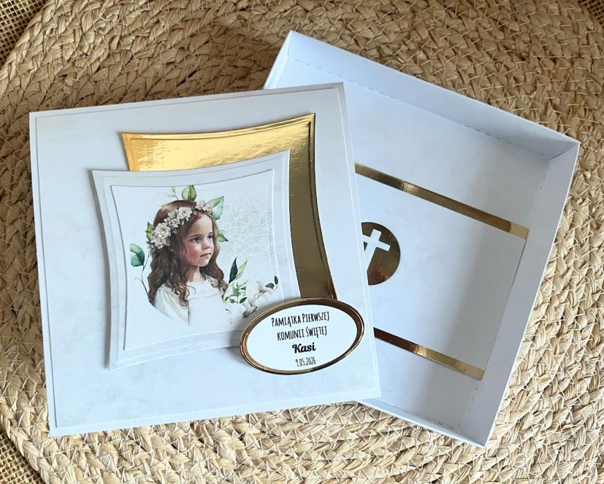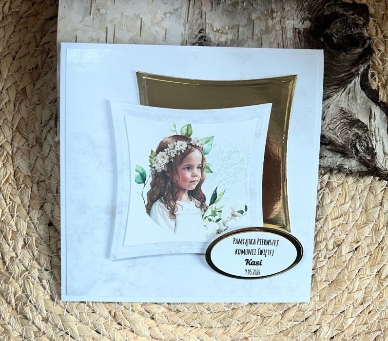 Ręcznie robiona przestrzenna kartka komunijna wraz z pudełkiem i torebką. Stworzona na białej bazie papierów z dodatkiem lustrzanego złota.Kartka jest zdobiona elementami komunijnymi,które tworzą dziewczęcą kompozycję.Kartka ma wymiary 14,0x14cm.Pudełko ma wymiary 15,0x15cm.Wewnątrz kartki zamieszczono gotowe życzenia do własnoręcznego podpisu oraz umieszczono kieszonkę na małe co nieco.Jest możliwość dodania imienia i daty komunii oraz imion osób składających życzenia.Proszę o umieszczenie w uwagach podczas zamawiania.