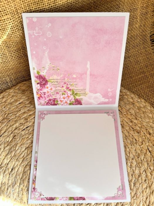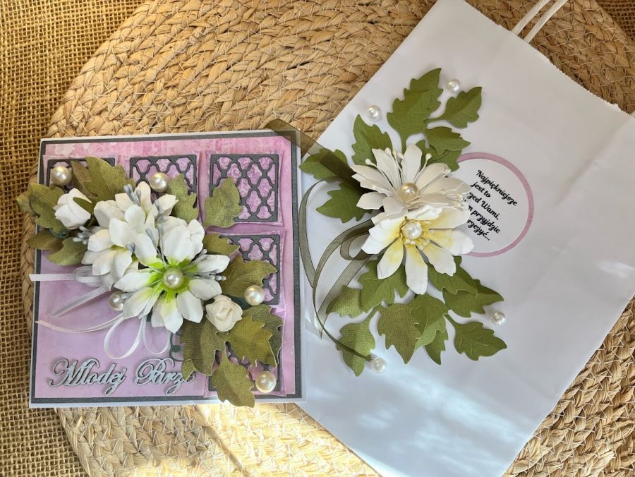 Kartka z okazji Ślubu wykonana ręcznie z niezwykłą starannością i dbałością o każdy detal. Na bazie z białego papieru, w naturalnej biało-różowo pastelowej kolorystyce z elegancką kwiatową kompozycją, ażurową bazą,Rozmiar kartki 14,0 x 14,0 cm. Wewnątrz kartki znajduje się miejsce na własne życzenia.W komplecie pudełko pudełko o tej samej stylizacji co kartka o wym.16,5x16,5cm na dnie kturego umieszczono kieszonkę na małe co nieco.Do kompletu dodano torebkę białą ozdobioną kwiatami i sentencją odpowiednią do uroczystośći. Wielkośc torebki 18x21x8cm.W tej postaci komplet dostępny od ręki. Jest możliwość dodania imion nowożeńców i daty ślubu oraz życzeń.Informację proszę umieścić w uwagach podczas zamawiania.
