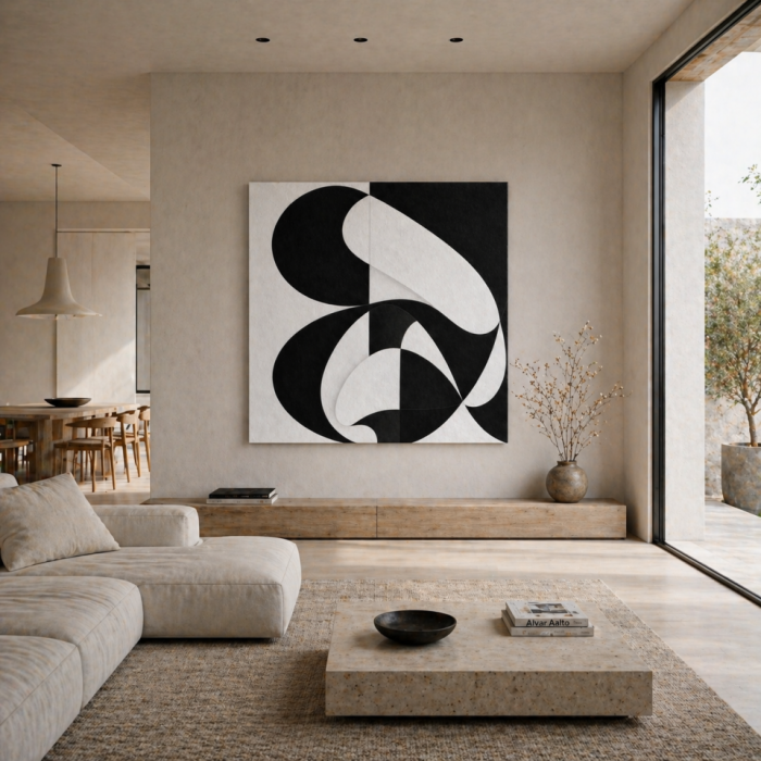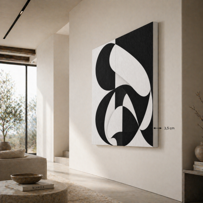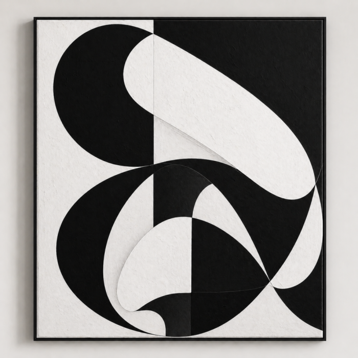 Nowoczesny obraz abstrakcyjny utrzymany w kontrastowej czerni i bieli, oparty na płynnych, organicznych formach geometrycznych. Kompozycja łączy minimalizm z wyrazistą formą, tworząc elegancki i ponadczasowy akcent do wnętrza.