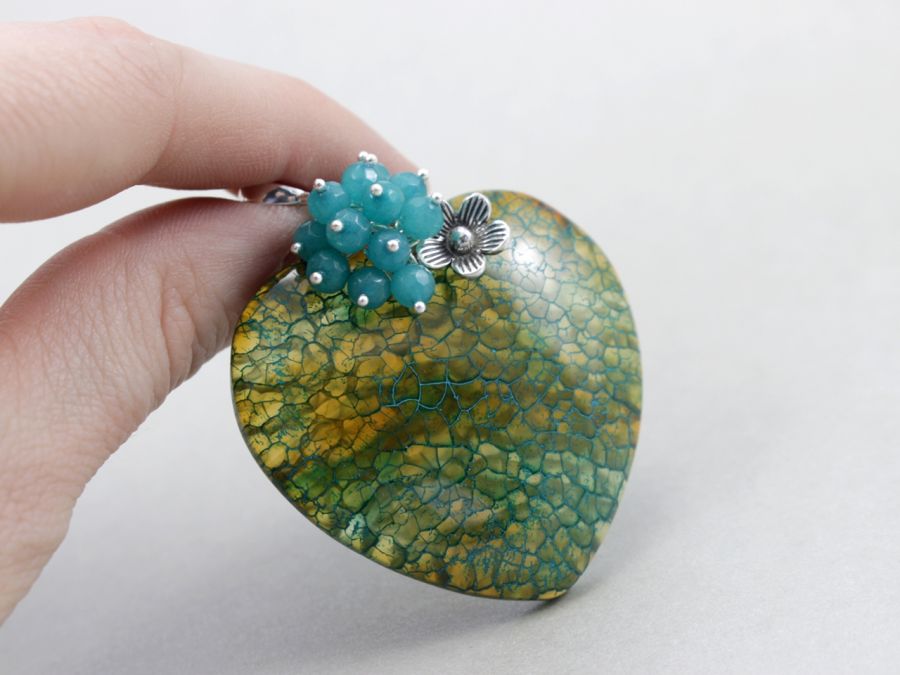 cieniowany. Na powierzchni kamienia znajdują się delikatne rysy i spękania- które podkreślają naturalne pochodzenie minerału, a które w niczym nie ujmują uroku biżuterii. Agat ozdobiliśmy pękiem fasetowanych, ok. 4mm jadeitów oraz srebrnym, oksydowanym ( specjalnie czernionym ) kwiatkiem. Nie należy "na siłę"przesuwać, przekręcać drobnych kamieni w celu np. zmiany ich ułożenia, ponieważ można przełamać srebrne druciki.