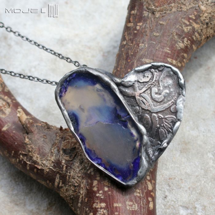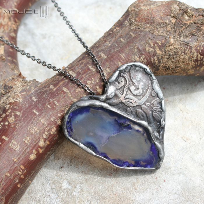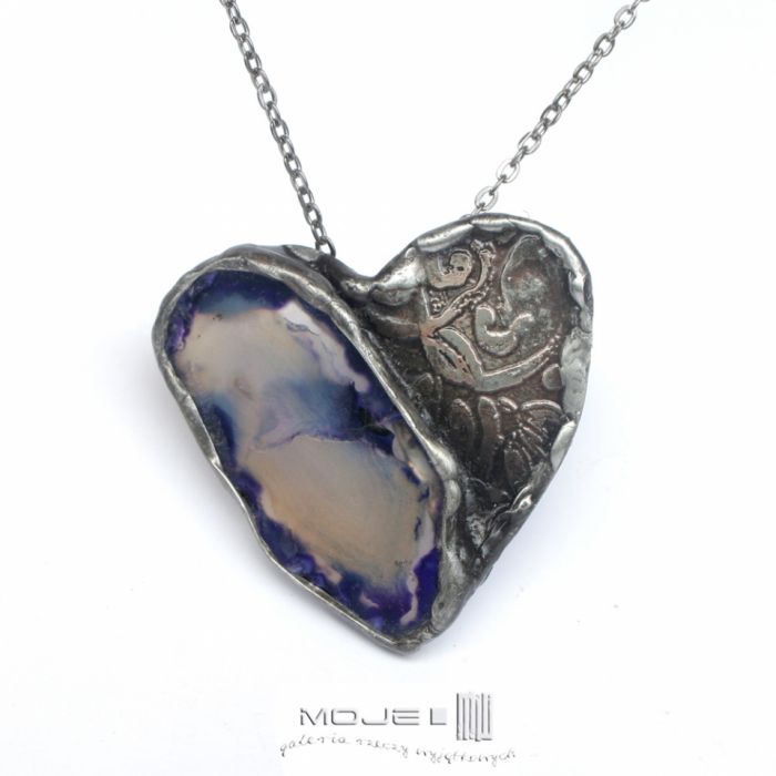 Wisior w kształcie serca z plastra agatu w fioletowo-beżowym melanżu i miedzi. Oprawiony i wykończony jest trawioną miedzią - cynowaną, patynowaną i przecieraną. Wisior zawieszony jest na łańcuszku w kolorze grafitowym.