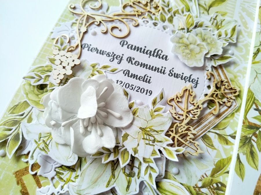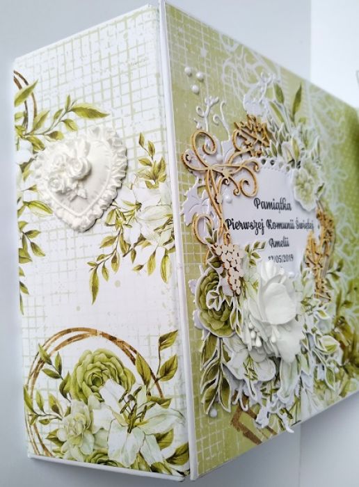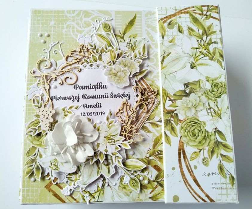 Album został wykonany z wysokiej jakości materiałów do scrapbookingu, w całości ręcznie według autorskiego pomysłu utrzymany w odcieniu zieleni.