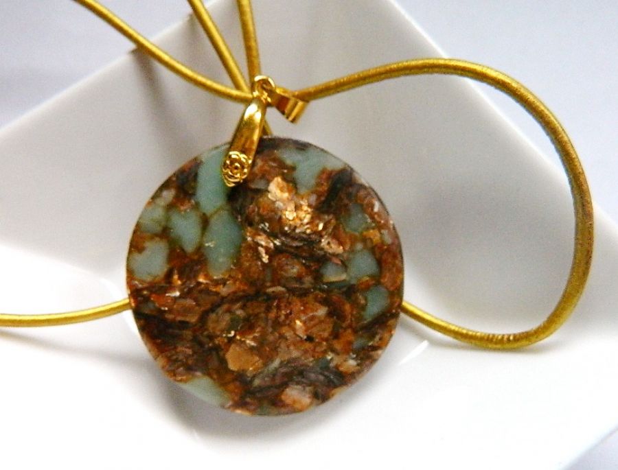 Zadaj pytanie dotyczące produktu: Amazonit z bornitem, duży okrągły wisior w złotej oprawie