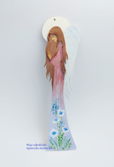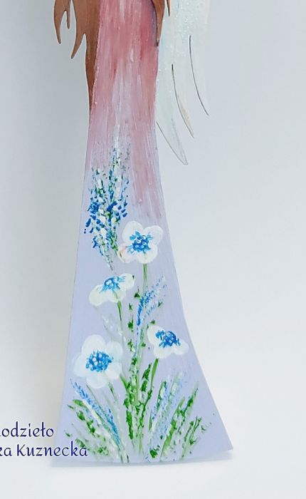 Jego suknia w kolorze różowo - liliowej ozdobiona jest ręcznie malowanymi, polnymi białymi i fioletowymi kwiatami. Skrzydła biało - błękitne posypane brokatem. Całość wylakierowana na połysk.