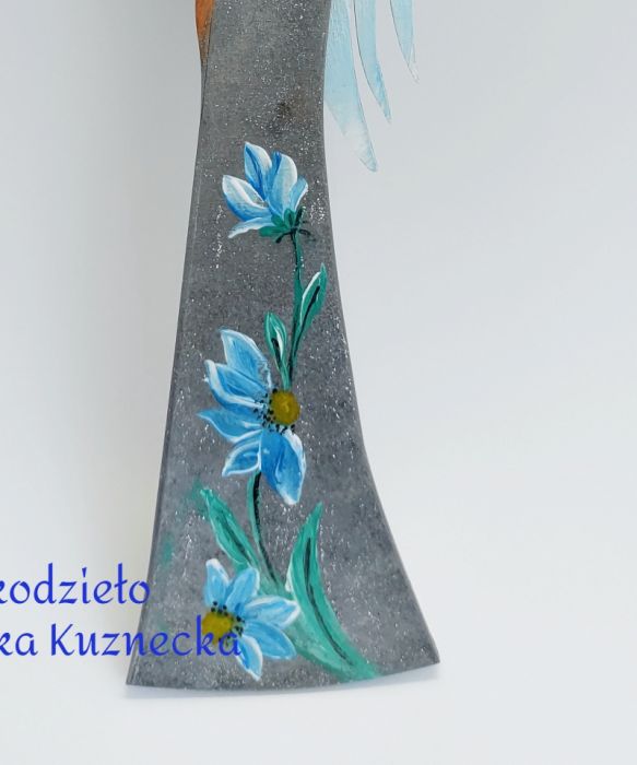 Jego suknia w kolorze głębokiego, gwieździstego popielu ozdobiona jest ręcznie malowanymi, błękitnymi kwiatami, które dodają mu lekkości. Suknia skrzy się delikatnie posypana brokatem. Całość wylakierowana na połysk.