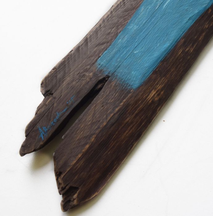 Obraz malowany farbami akrylowymi, w tym metaliczną złotą farbą, na starej desce o unikalnym kształcie, na której zachowane zostały otwory po gwoździach, dzięki czemu obraz ma swoją ukrytą historię ;) Deska jest bejcowana, cały obraz zabezpieczony jest werniksem dla ochrony przed wilgocią.
