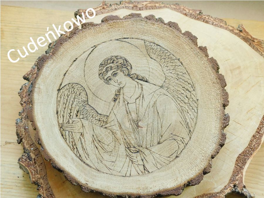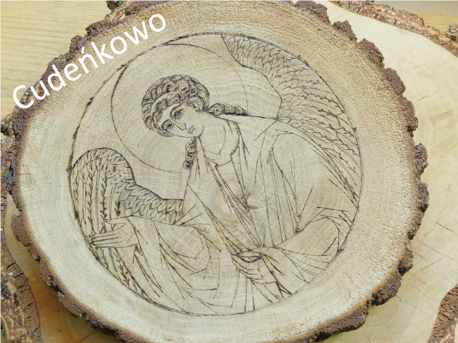 Dekoracja wykonana na plastrze debowym za pomocą pirografu z motywem Anioła Stróża.