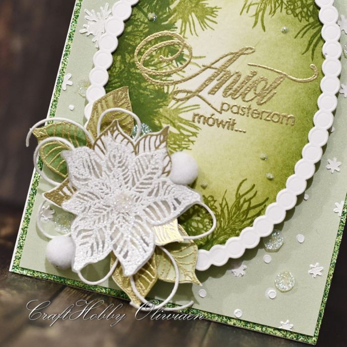 Wyjątkowa, oryginalna kartka świąteczna z okazji Bożego Narodzenia. Wykonana z bezkwasowych papierów do scrapbookingu, ozdobiona wzorem śnieżynek naniesionych na perłowy panel tła pastą strukturalną, stemplowanymi gałązkami sosny z embossowanym napisem, kompozycją ze stemplowaną i embossowaną poinsettią, mini pomponikami, brokatowymi cekinami i sznureczkiem. Całość pięknie mieni się i skrzy pod światło.