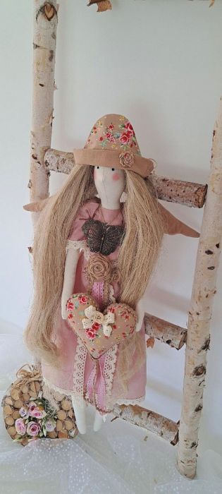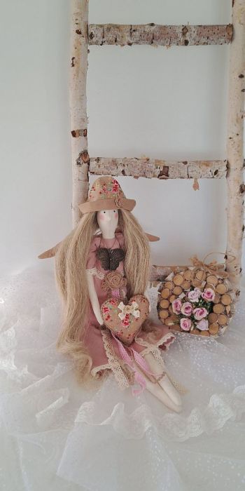 Mam do sprzedania własnoręcznie uszytego anioła stróża widocznego na dołączonych fotografiach. Ciałko uszyte z surówki bawełnianej, wypełnionej antyalergiczną kulką silikonową. Sukienka uszyta z wysokogatunkowej bawełny koloru pastelowego różu przyozdobiona bawełniana koronką koloru ecri a w pasie również różowego i jutową. Na szyi metalowy ażurowy motel. W pasie i na kapelusiku kwiaty materiałowe również wykonane przeze mnie. W rączce trzyma serduszko wykończone jutową koronką oraz ozdobione kokardką z bawełnianej koronki oraz drewnianym guziczkiem z napisem handmade with love.Skrzydełka uszyte z bawełny barwy jasnego brązu. Włosy wykonane z pakuły lnianej. Wysokość anioła 61 cm. Można go zawiesić, albo posadzić. Pomysł na prezent z różnych okazji, ale myślę, że i bez okazji też można nim obdarzyć kogoś na kim Ci bardzo zależy i wywołać radość w sercu:)