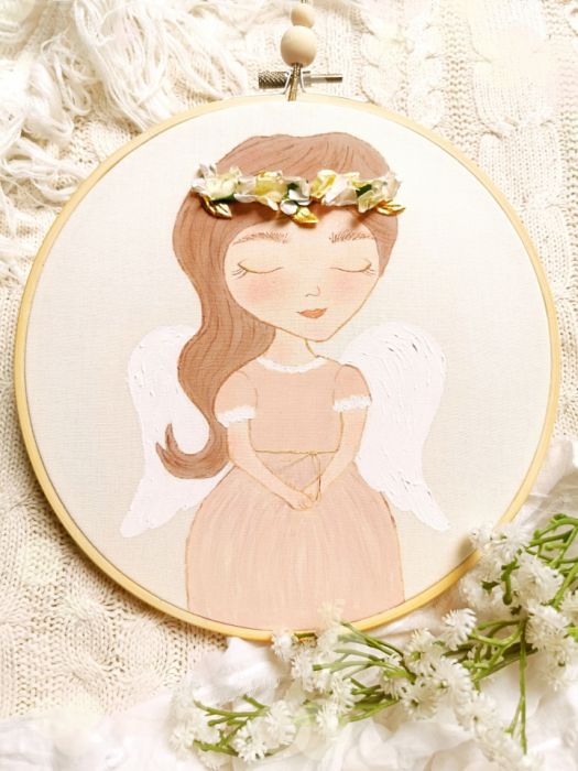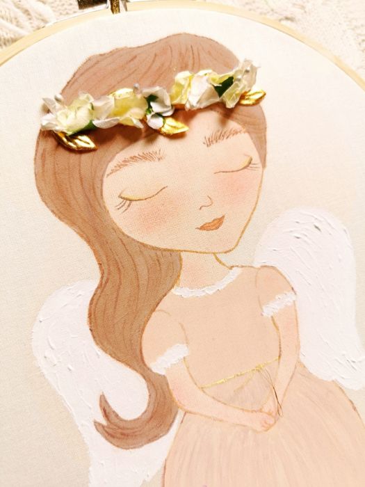 Obrazek został namalowany farbami akwarelowymi na bawełnianym płótnie, zawiera elementy haftowane ręcznie.