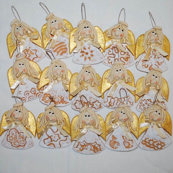 Aniołki na każdą okazję, także nieprzeciętny upominek dla naszych gości. Mogą stać się ozdobą naszego domu i być atrakcyjną świąteczną dekoracją. Zapakowane w celofanowy woreczek z dołączoną wizytówką o treści zgodnej z zamówieniem klienta. Wykonane są z masy solnej, termicznie utwardzane, malowane i lakierowane. Wielkość, bez zawieszki, ok 8 cm. Komplet- 15 szt.